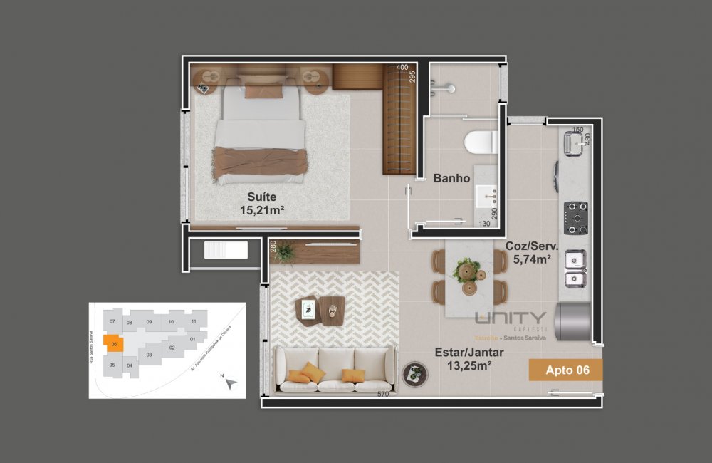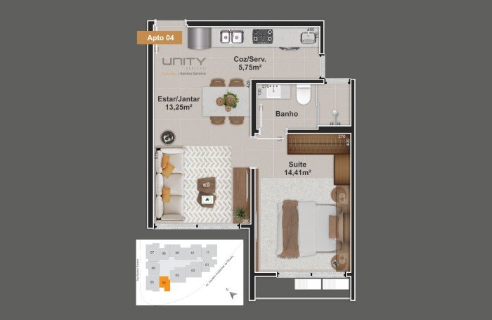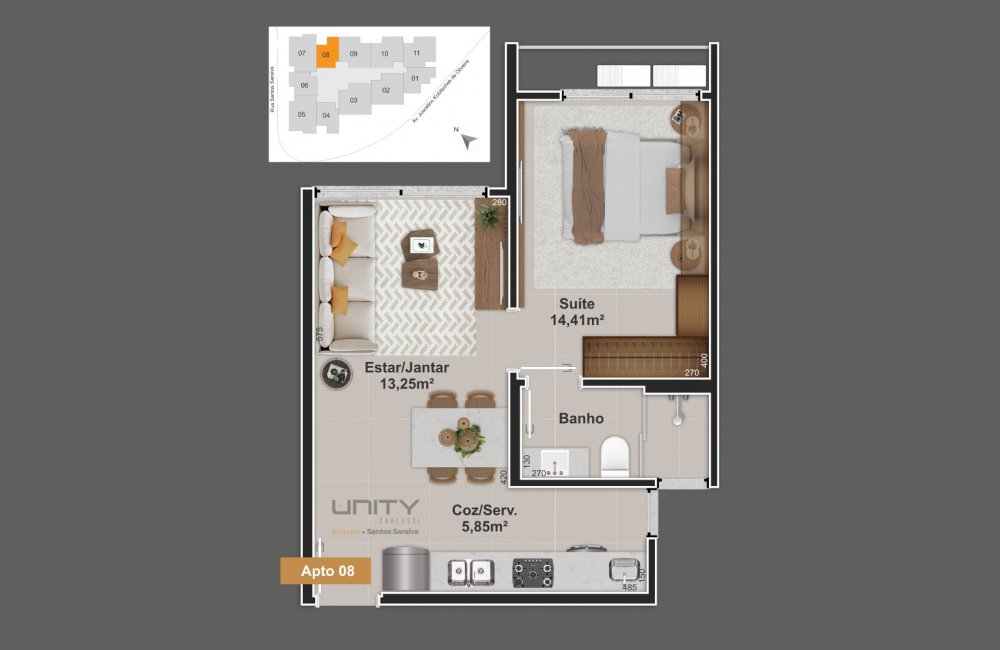 O Unity - Santos Saraiva é um empreendimento de alto padrão construtivo com 10 pavimentos, com ambientes de lazer mobiliados e decorados no rooftop.