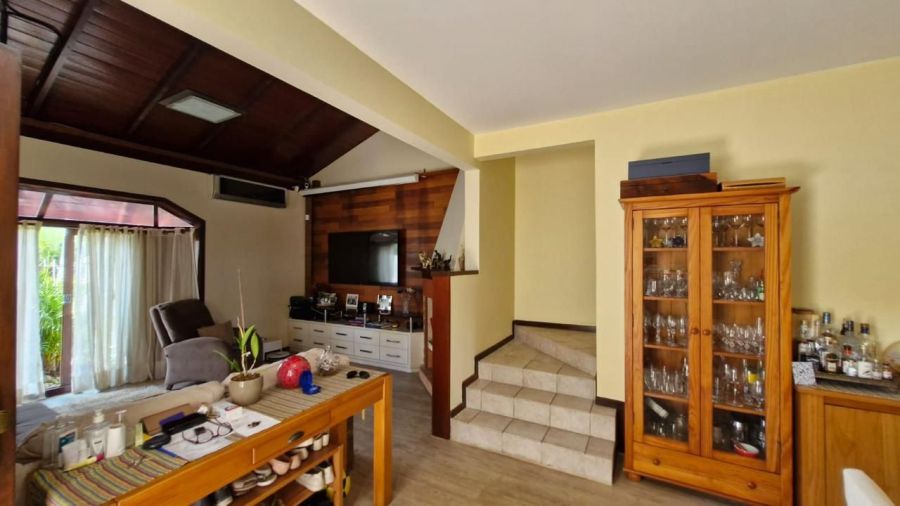 No térreo temos um amplo ambiente integrado tendo sala principal com lareira,copa,cozinha funcional,Banheiro,Lavanderia,acesso ao pátio e a área social no espaço externo com churrasqueira a carvão,piscina e pátio arborizado.